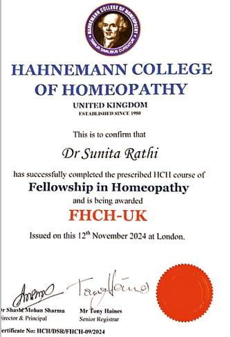 Dr. Sunita Rathi has been recognized and certified for her expertise and dedication in the field of homeopathy and related practices.